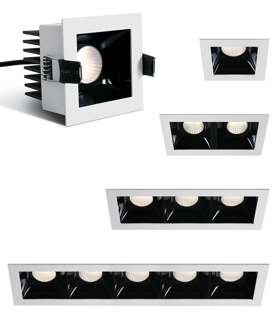 This range features a square, recessed design with a white bezel and a black optical chamber that helps create a tidy, focused appearance in the ceiling. The form is compact and available in four layouts that repeat the same modular light cell, giving designers and homeowners options that scale from single-point lighting to longer linear runs.