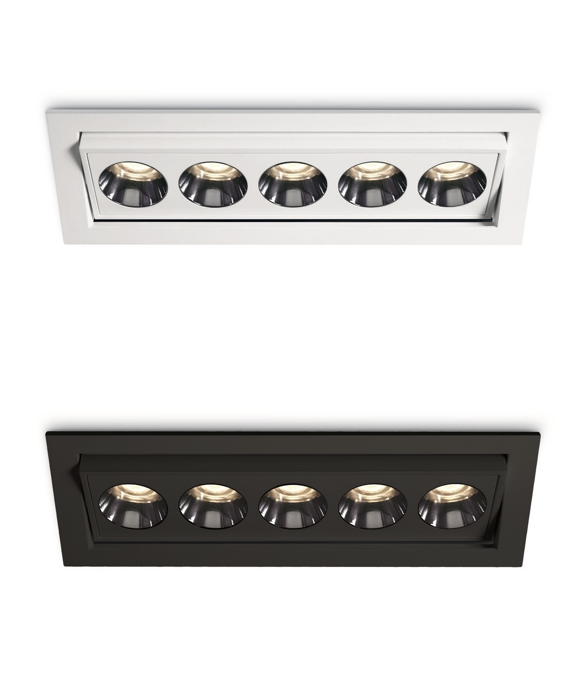 The fitting uses a slim rectangular housing with four recessed LED chambers arranged in a linear format. Each chamber sits within a dark light reflector that helps to reduce glare and create a controlled, comfortable beam. The frame is available in white or black and settles neatly into the ceiling, giving an architectural finish. The inner section is adjustable in one direction so the beam can be set to highlight walls, surfaces or specific features.