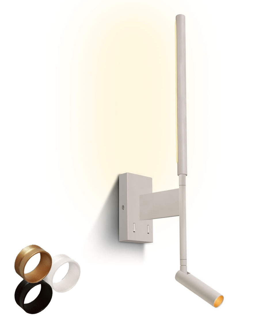 This contemporary wall-mounted light combines two integrated LED sources within a single fitting. The slender vertical light at the top provides a soft wall wash, creating a gentle reflected glow. Below, an adjustable cylindrical spotlight offers directional light for reading or task use. Both are mounted on a compact rectangular wall plate finished in neutral tones to suit modern interiors.