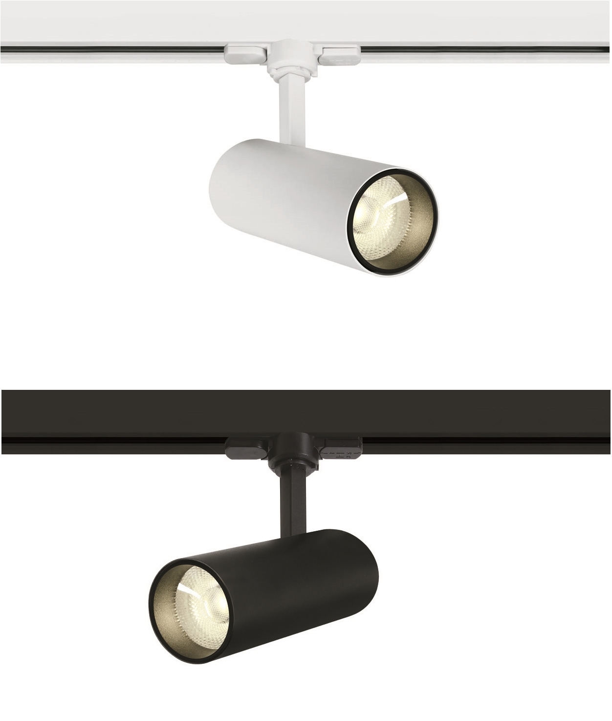 This compact 55 mm cylindrical LED track light brings precision and performance together in a refined, minimal form. The aluminium housing encloses a Sanan 9.5 W COB LED light source, producing 900 lumens from a single point of light for perfect beam definition. The reflector and inner baffle control glare effectively, giving a professional finish suited to both commercial and residential interiors. Offered in matt white or matt black to match Global, Eutrac and other Euro 3-circuit track systems.