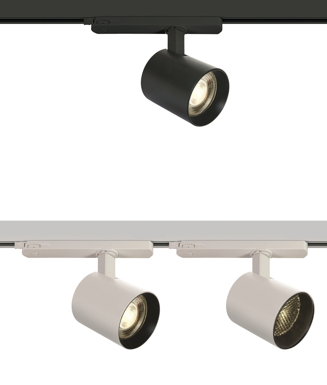 A precision-engineered cylindrical track spotlight built around a Bridgelux COB LED module. The aluminium housing conceals a selectable power system allowing operation at 10 W, 15 W or 20 W, producing 1200, 1800 or 2400 lumens from a single optical source. The deeply recessed reflector controls glare and enhances visual comfort, with interchangeable bezels that let you adapt the appearance to the environment. Finished in matt black or matt white, the fitting integrates seamlessly with Global, Eutrac and other three-circuit track systems.