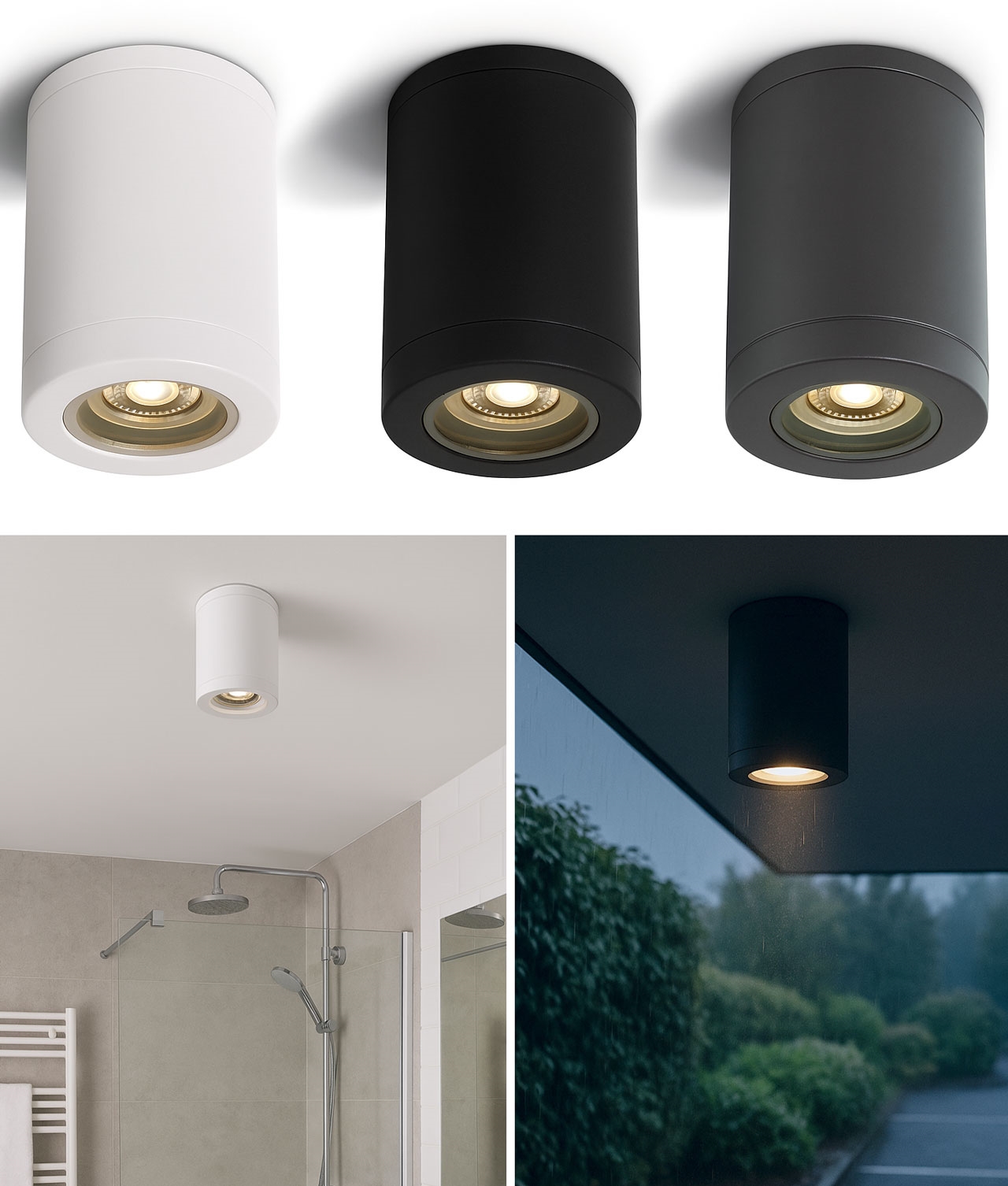 £17.50 inc VATThis ceiling-mounted cylinder downlight offers a sleek and modern design, making it an ideal choice for contemporary spaces. Crafted with durability in mind, this downlight is IP65 rated, ensuring it is fully protected against dust and water, making it suitable for use in areas where exposure to moisture is a concern, such as bathrooms or outdoor settings.
