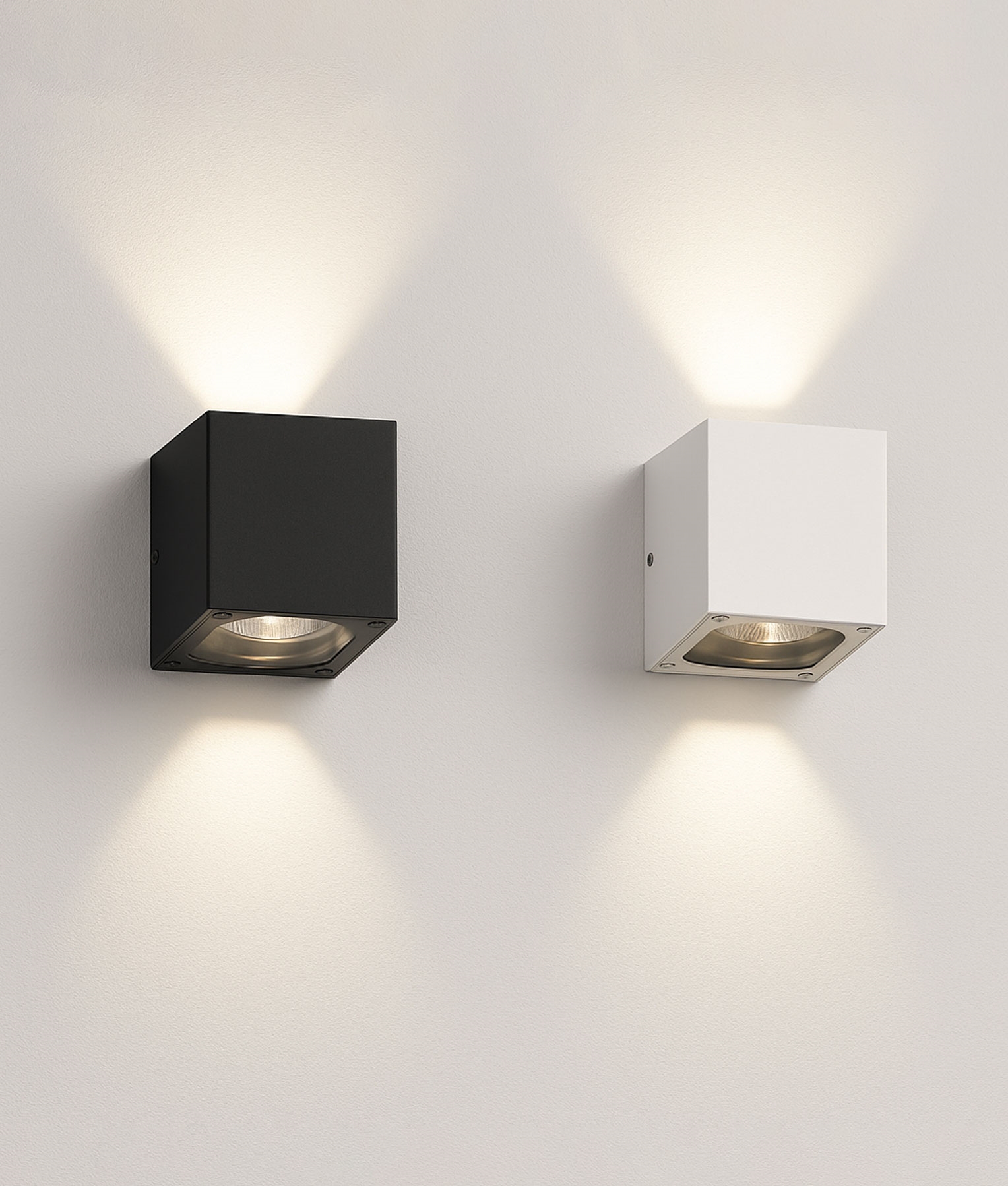 Made from die-cast aluminium with a powder-coated finish in white or anthracite, the compact cube form fits neatly against the wall. Its clean geometry creates two defined beams of light that accent surfaces and add shape to façades, entrances, and interior walls.