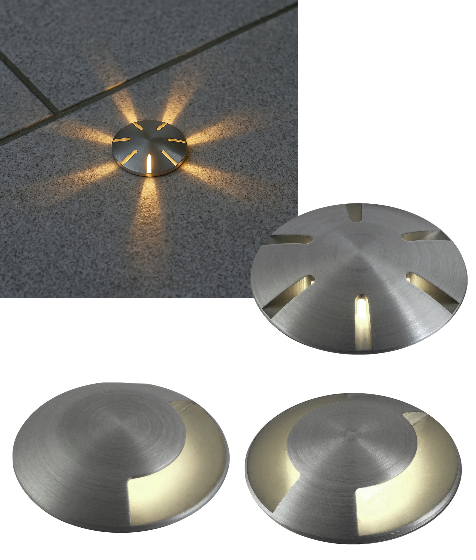 The range is designed to mark the edges of steps, highlight raised deck perimeters or provide wayfinding along paths. The light escapes through precision machined slots which define the distribution pattern. The single slot version produces a directional marker, the twin slot version offers two sided guidance and the six way model provides an all round marker for visibility from any direction. The fittings cast a soft pool of low level light that improves awareness without causing glare.