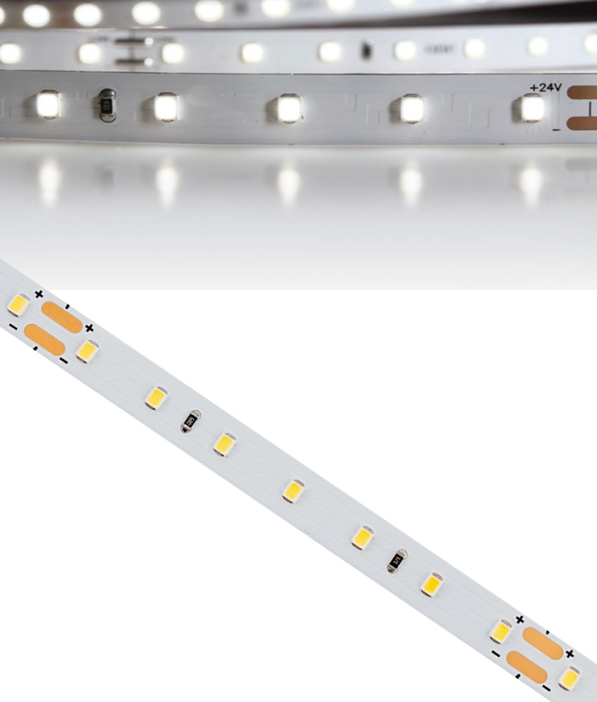 This LED strip consumes 9.6 watts per metre and produces up to 864 lumens per metre. It uses SMD2835 chips with CRI 90 to provide high-quality illumination for a wide range of interior projects.