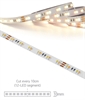 This high-performance LED tape provides adjustable white light across the full spectrum from extra warm 2700K through to daylight 6500K. It uses Refond SMD 2835 chips arranged on a 10mm wide flexible strip and is supplied in 5-metre rolls. Each roll can be cut every 100mm (12 LED segments), making it easy to size for your installation. The tape requires a 24V DC supply, and has a 3-core cable with separate circuits powering the 2700K and 6500K chips. By varying the voltage balance between the two, any shade of white within the range can be achieved.