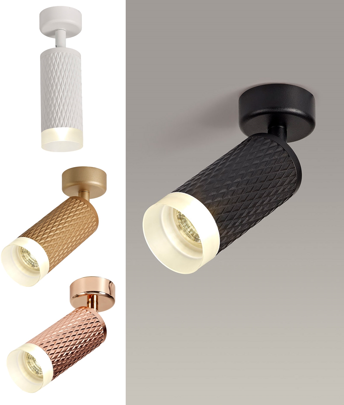 From £67.00 inc VATAn adjustable ceiling spotlight designed for a GU10 lamp and with a diamond pattern looking like a mesh. Available in black, white or rose gold with an opal diffuser to the bottom of the spot to help diffuse the light. Could also be installed on a wall.