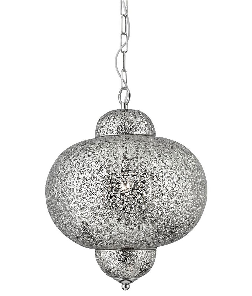 £113.45 inc VATThis vintage, bulbous, metal pendant light comes in a polished nickel finish. Its shade is comprised of three rounded shapes: a large oval in the middle and smaller ones on the top and bottom. The metal is punctured with intricate motifs and cut-out designs that give it a Moroccan feel. Suspended from a height adjustable chain with a maximum drop of 1.2 metres.