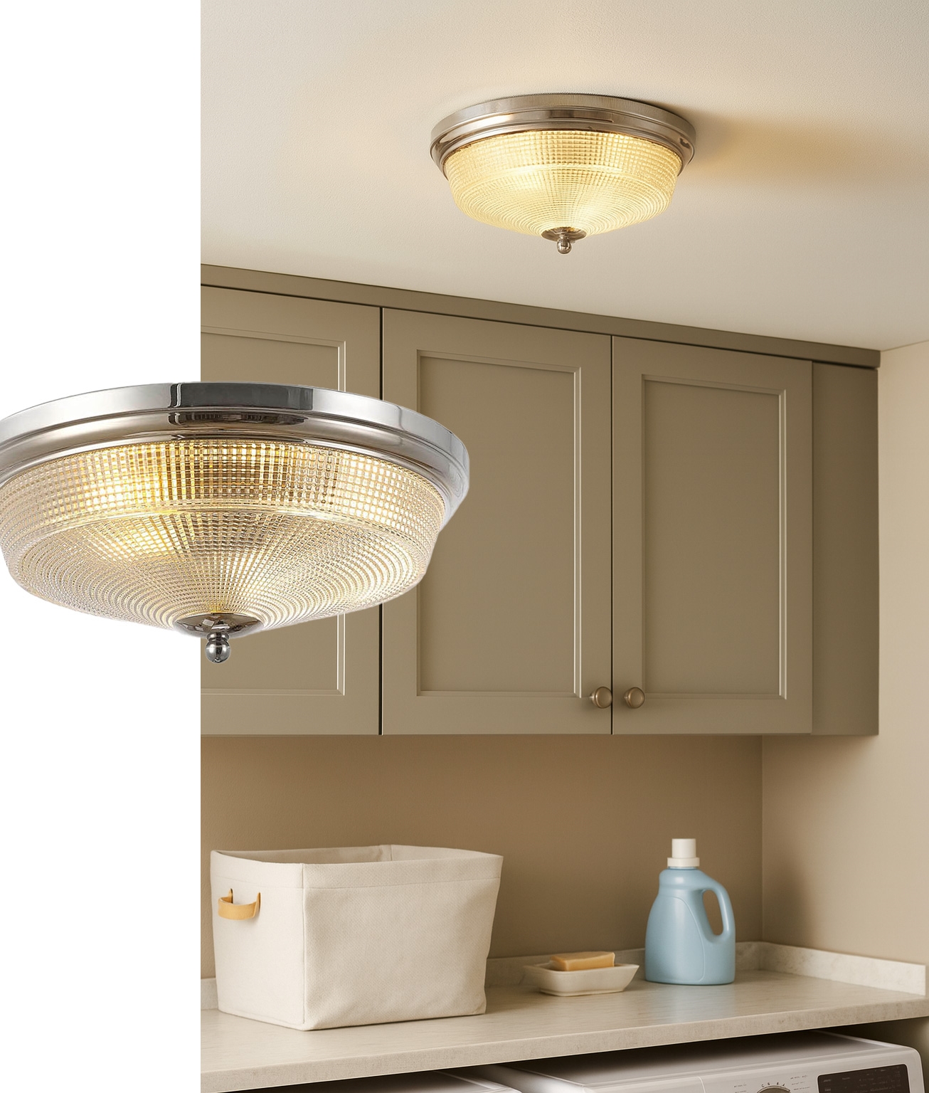 From £172.00 inc VATThis flush ceiling light brings a practical touch to a utility room, offering balanced illumination that spreads evenly across work surfaces. The prismatic glass softens the brightness, creating diffused lighting that helps reduce harsh shadows, making tasks such as sorting laundry or organising supplies easier.