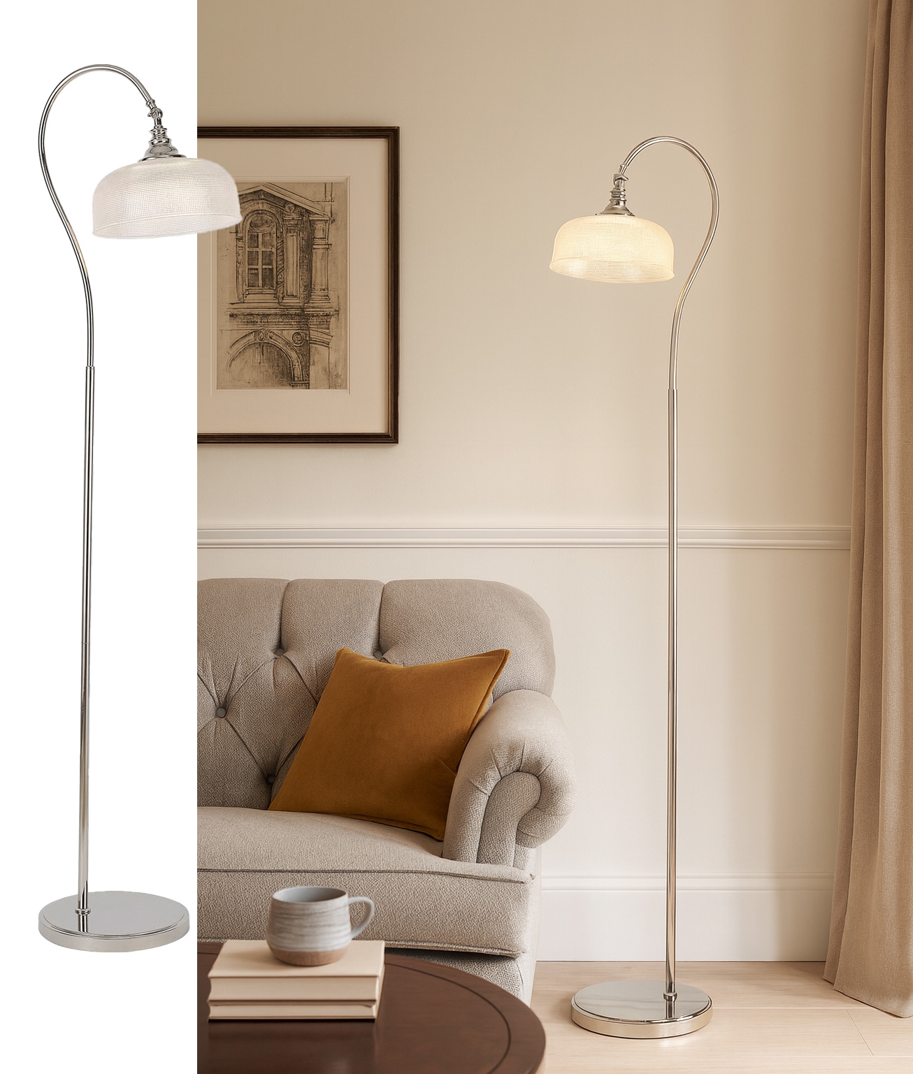 Its slim profile sits neatly beside a sofa or armchair, making it suitable for both modern and traditional interiors. The refined finish and curved form offer a practical and stylish lighting option for everyday living.