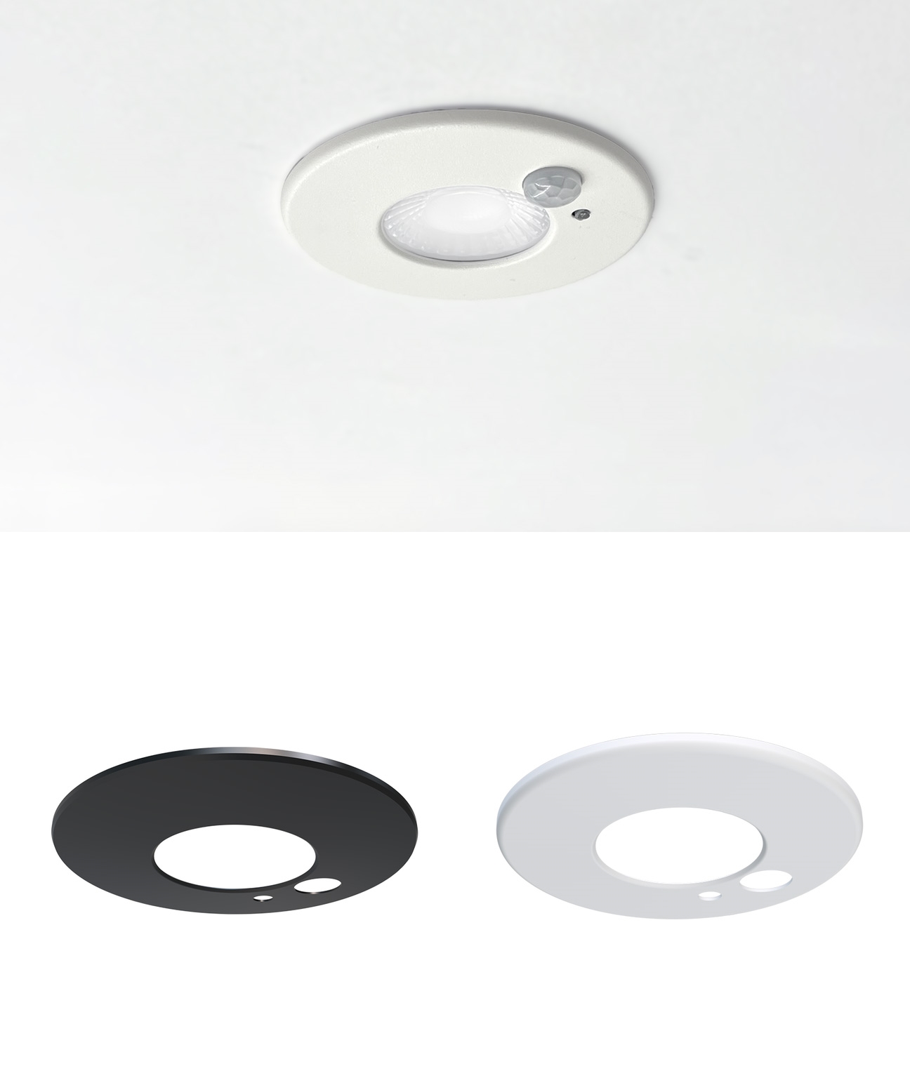 The fitting is recessed and fire rated for 30, 60 and 90 minutes. It suits a 70 millimetre cutout and requires only 34 millimetres of void space, including plasterboard. It is safe for use under insulation, making it suitable for a wide range of ceiling constructions. A loop-in, loop-out Wago style connector with a quick release plug simplifies wiring. The product is supplied without a bezel so the preferred finish can be added separately. Magnetic bezels in white or matt black attach securely and lift away easily when decorating or adjusting the PIR settings.