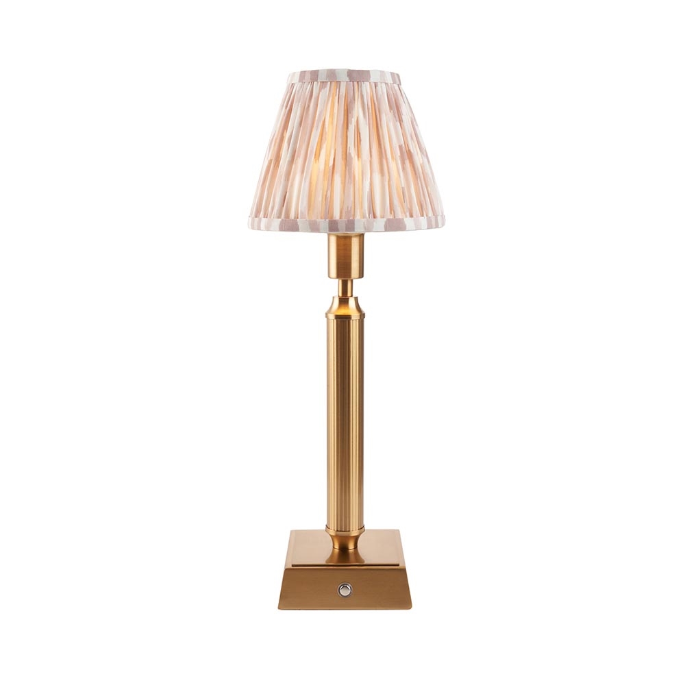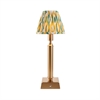 This rechargeable table lamp combines classic design with modern practicality. The reeded brass column and square base give it a timeless character, making it suitable for both traditional and transitional interiors. Shade choices include the Classic White for a crisp, traditional finish, three Leaf Pattern options for a soft botanical theme, and five Ikat-inspired designs in a range of colours. Each shade is pleated fabric, complementing the warm brass base and providing gentle diffusion of light.