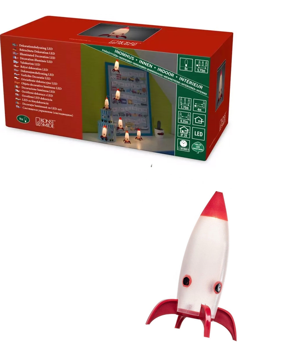 £24.00 inc VATThis is a delightful string light set which contains eight rockets in white and red. Inside each rocket is a warm white LED lamp. These string lights will make a great feature ornament in a room whether it is a child's room or adults - let your inner astronaut come to the fore!