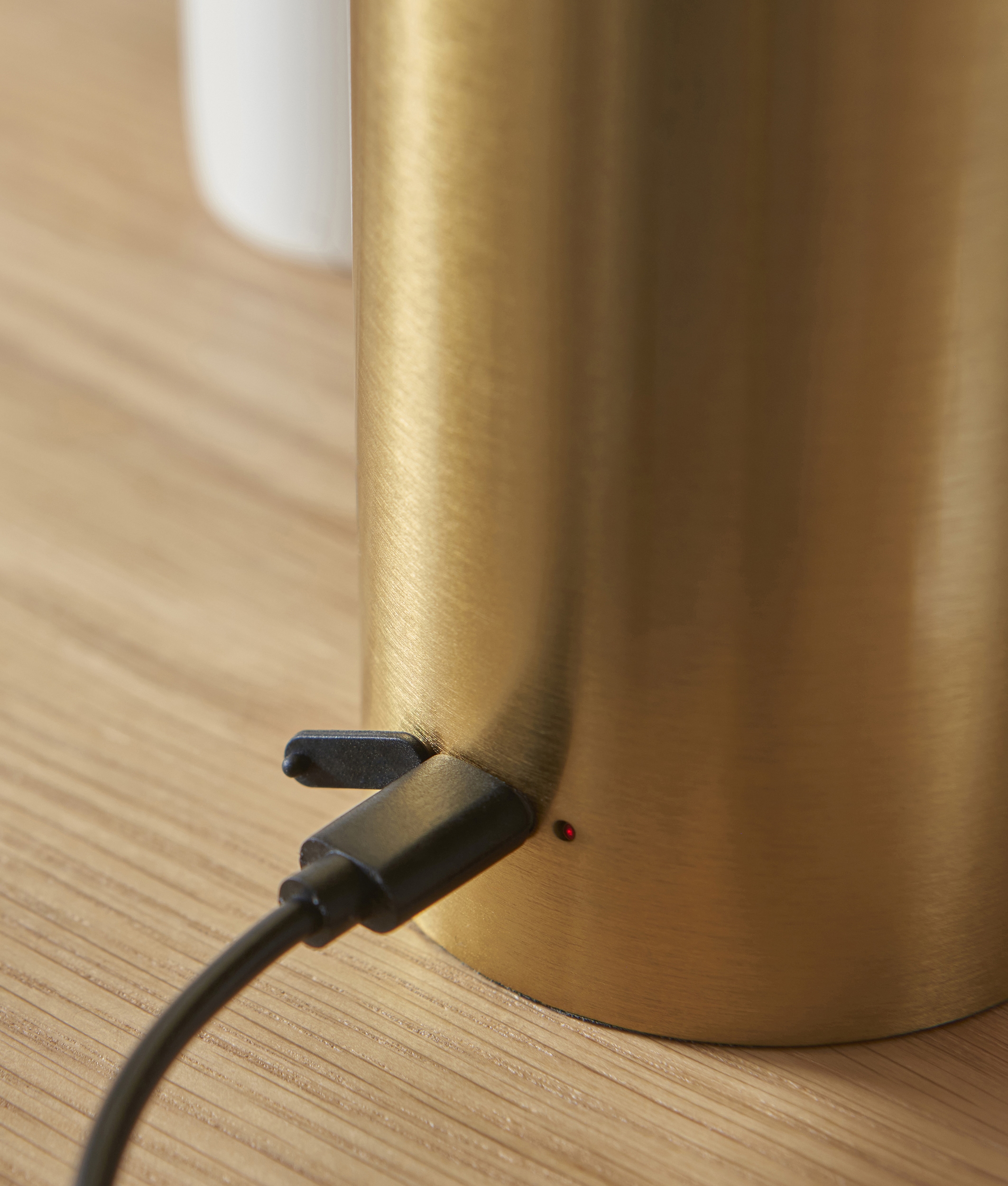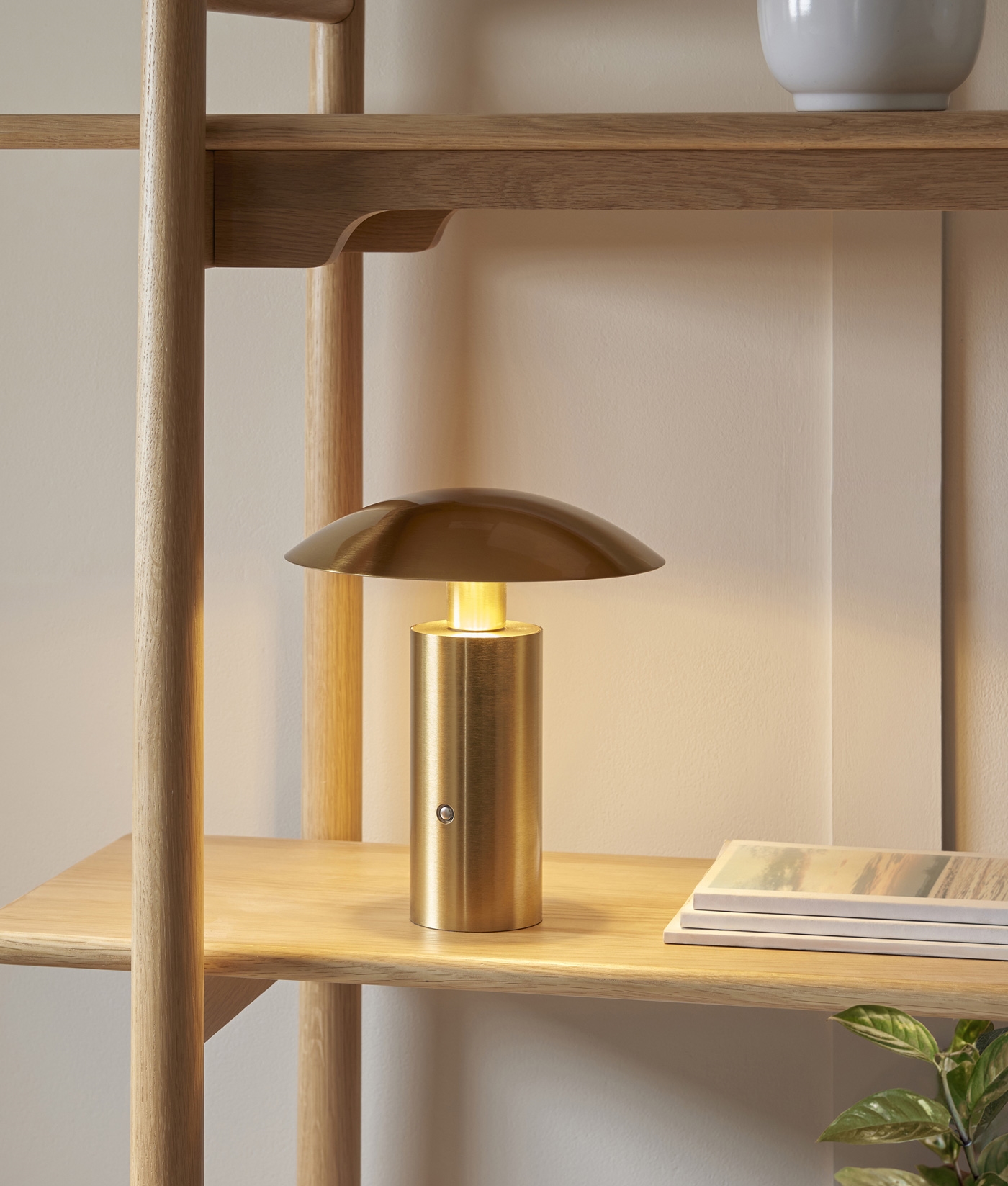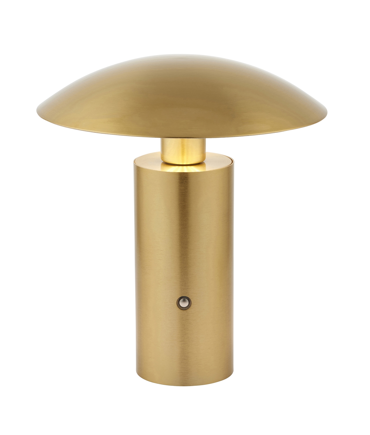 £69.00 inc VATThis Scandi style rechargeable table lamp combines refined design with modern functionality, finished in warm brushed gold for a polished, contemporary look. The dome shade will focus light downwards so it will be low glare and soft for tables or side units for example. High quality design coupled with practicality.
