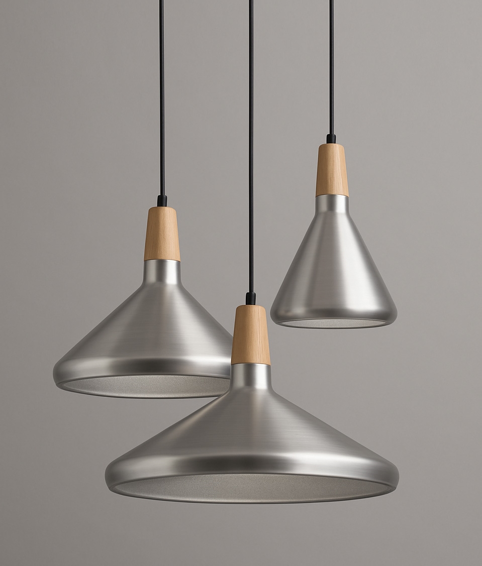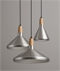 £90.00 inc VATThis large Scandinavian-inspired pendant brings together three distinct aluminium shades, each suspended from a single ceiling plate. The shades vary in shape for a relaxed, informal look, while the silver-toned hard anodised finish gives a refined, contemporary edge. Each shade is topped with a wooden finial, adding warmth and contrast to the cool metallic tones.