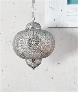 With its curved shape and wide bottom, this fitting projects the light in a downwards direction to illuminate the surface below. The intricate and delicate, cut-out patterns that adorn the shade allow illumination to shine through and creates a fascinating pattern of light and shadow on the surrounding walls whilst the coloured glass stones catch and reflect the light.