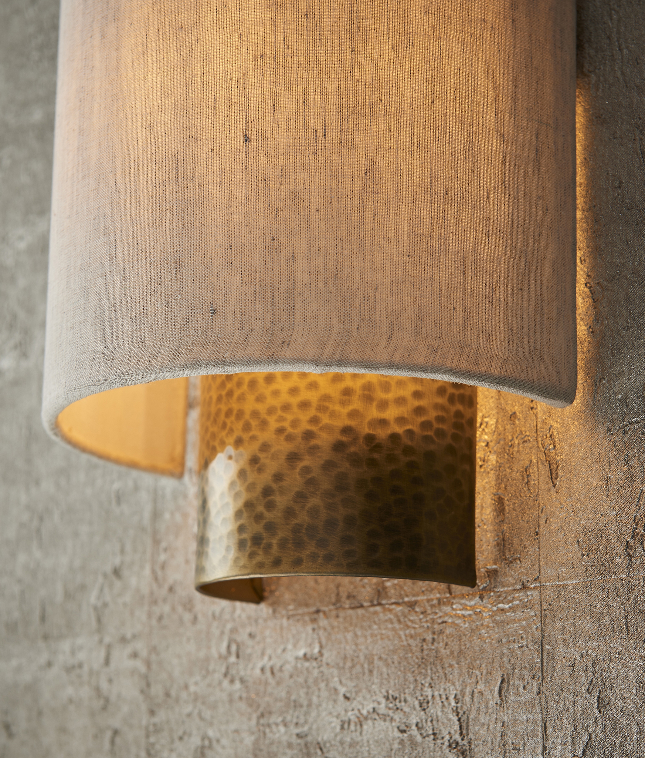 £98.00 inc VATThis elegant and modern wall light has an unusual, hammered, aged bronze finish and natural linen effect, fabric shade. A long, curved metal wall plate sits flush to the wall and is surrounded by a shorter, semi-circular shade.