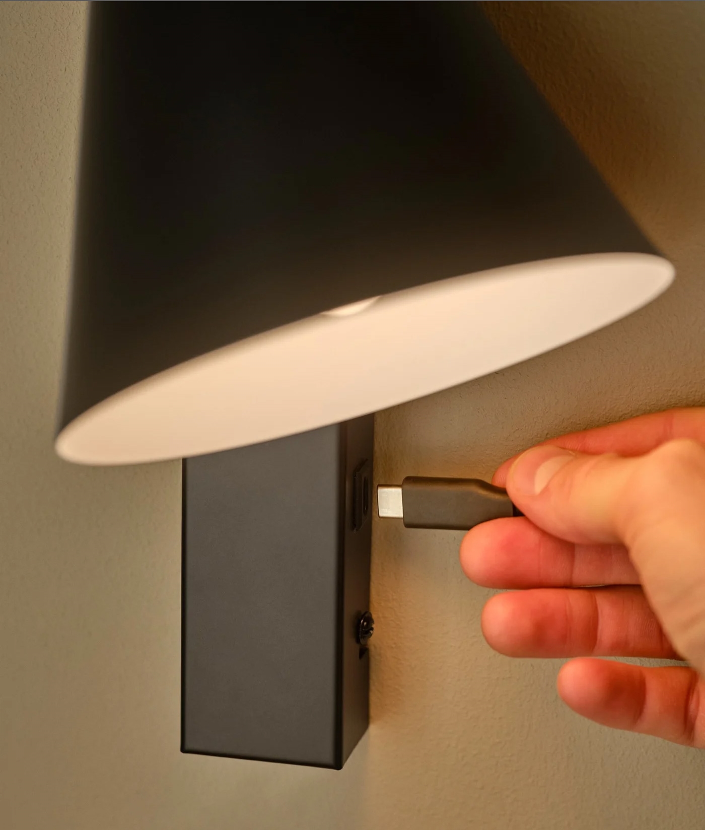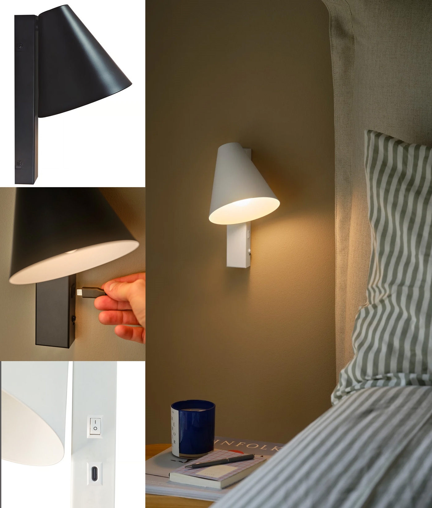 £39.95 inc VATThis adjustable wall light is designed for practical, everyday use, combining focused task lighting with added charging convenience. Its clean cone-shaped shade can be angled in two directions, allowing you to direct light exactly where it is needed without repositioning the fitting.