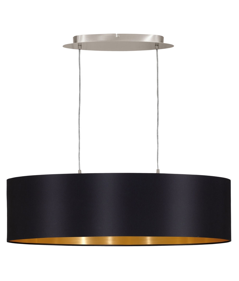 £90.00 inc VATThis is a black textile suspended pendant with an elongated, oval shaped shade which is perfect for installation over a dining table, desk, breakfast bar or living space. As there is no diffuser on the bottom of the shade, these lights will give you directional light, both down and up, and a soft illumination through the shade.