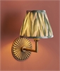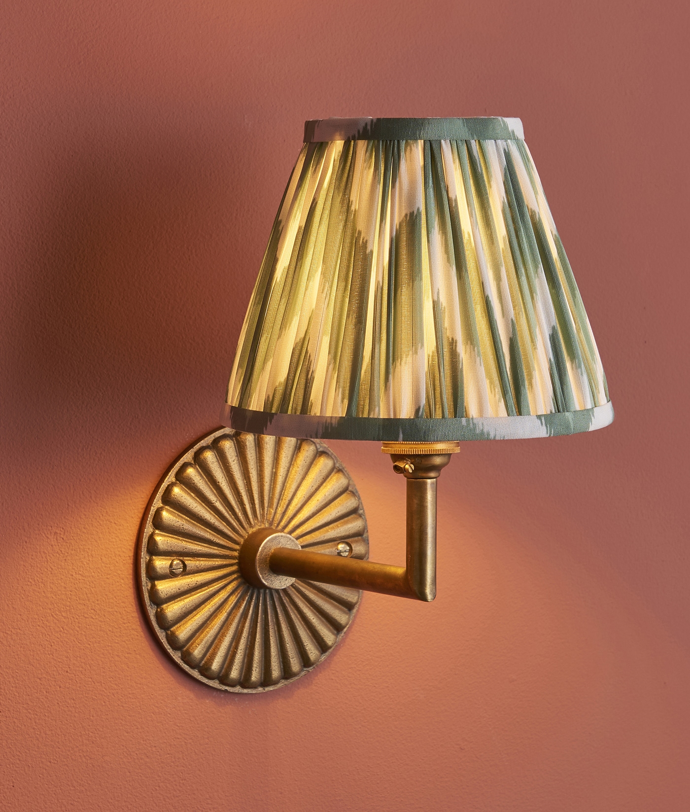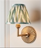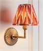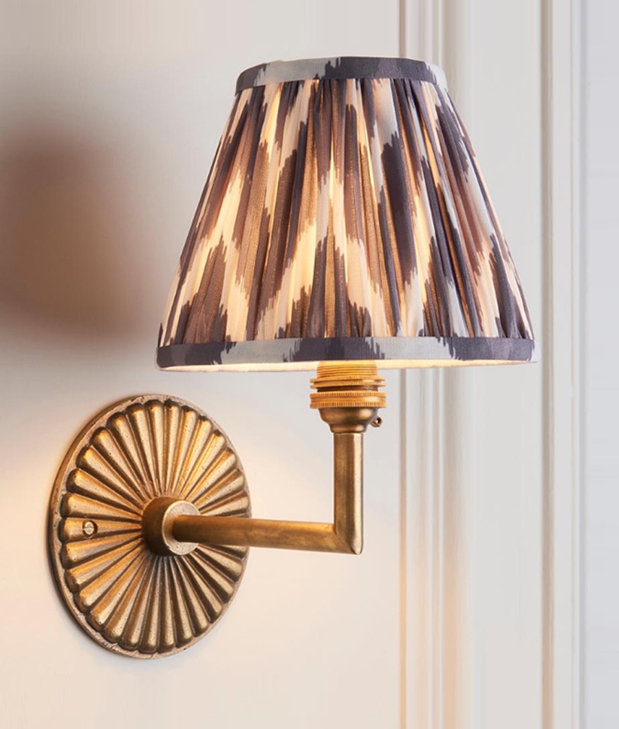 £94.69 inc VATThis wall light combines classic form with refined detailing. The angled arm in aged brass extends from a ridged circular backplate, creating a balanced design that adds depth and warmth to the wall. Its pleated shade features a striking zigzag pattern in neutral and either apricot, green or grey tones, softening the metallic finish with a touch of texture and visual interest.